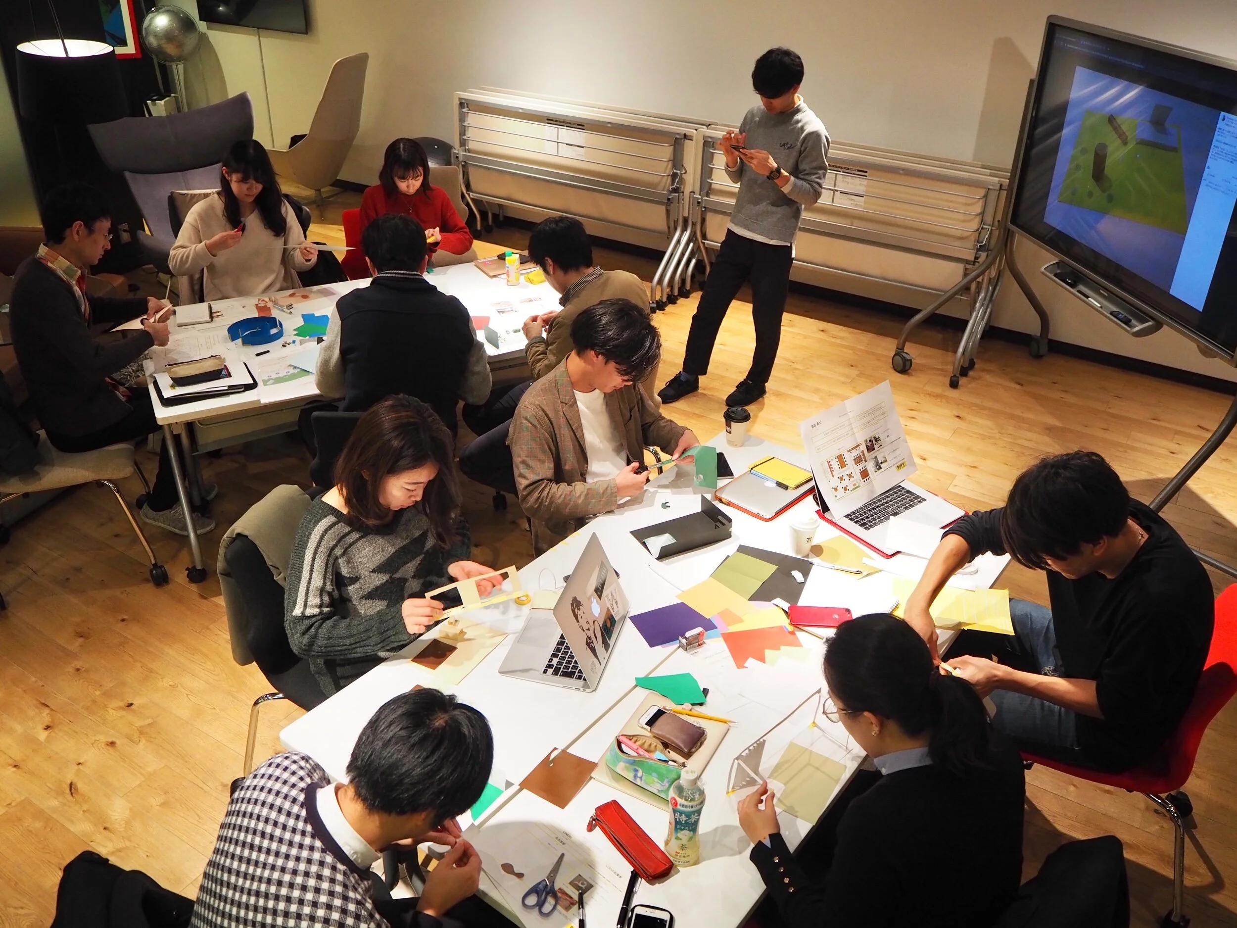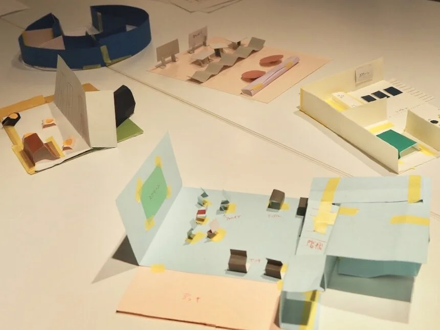 課題は「あなたが作りたいスペースをペーパープロトで表現してみよう」。画用紙を切ったり貼ったりして、頭の中に思い描いているスペースを表現するというもの。