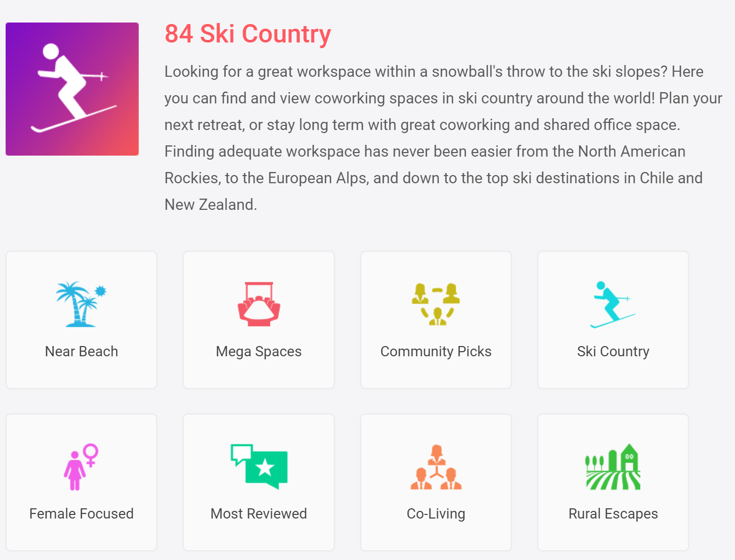 また、別に組まれた特集もあり、例えば、今の季節にピッタリな「Ski Country」=スキーリゾートの近く、という切り口でコワーキングスペースを探すこともできます。スキー好きのノマドワーカーの人などには、魅力的な特集ですね。