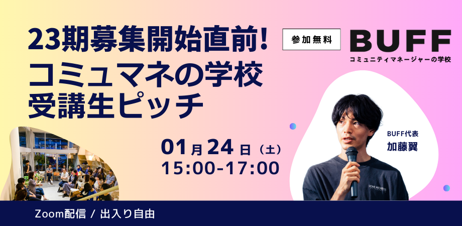 A BUFFではコミュニティマネジメントの本質に重きを置いた講座です。考え方や視座はオンラインとオフライン問わず適応が可能です。過去にもオンラインのみのコミュニティ運営者の受講生もいます。